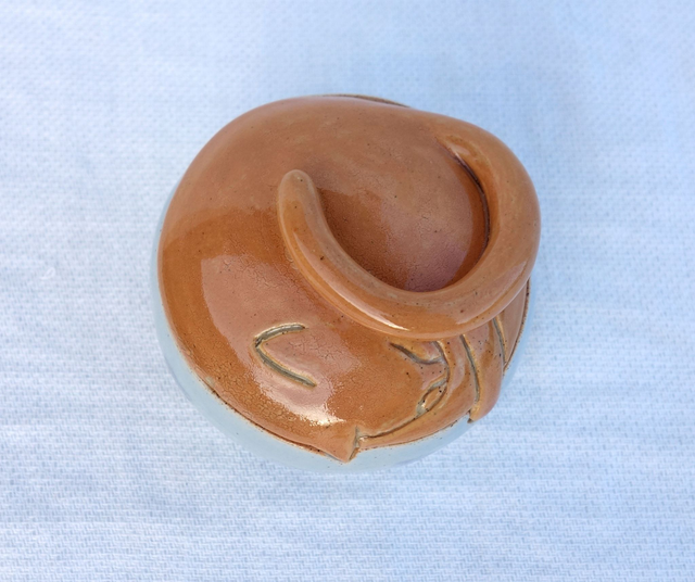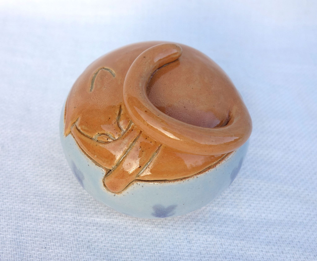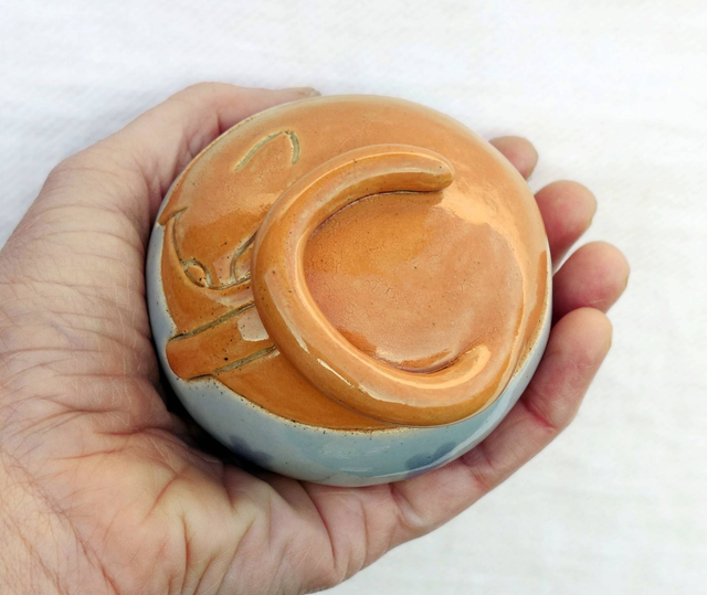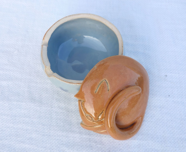 La boite céramique, Chat Roux endormi sur coussin, est en grès moucheté décoré à l'engobe et à l'émail. Façonnée à la main, chaque exemplaire de cette boite sera unique. Pour ouvrir cette boite secrète, prenez la queue du chat et soulevez le couvercle.